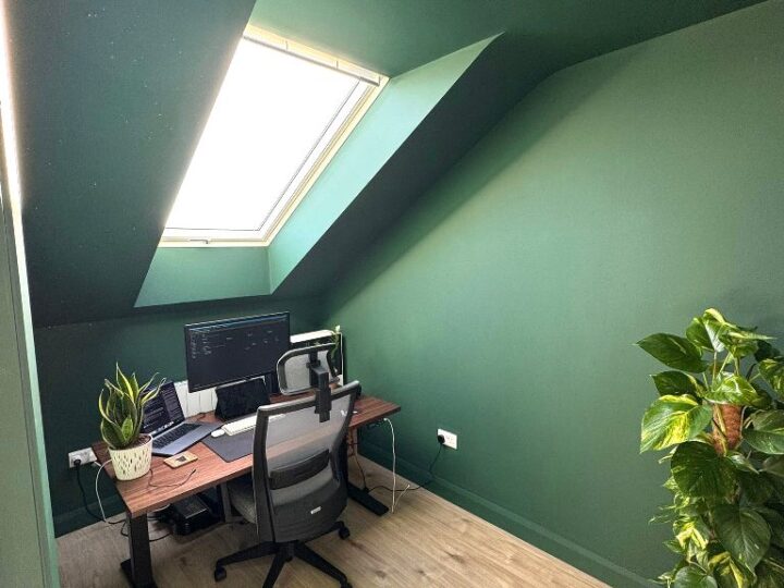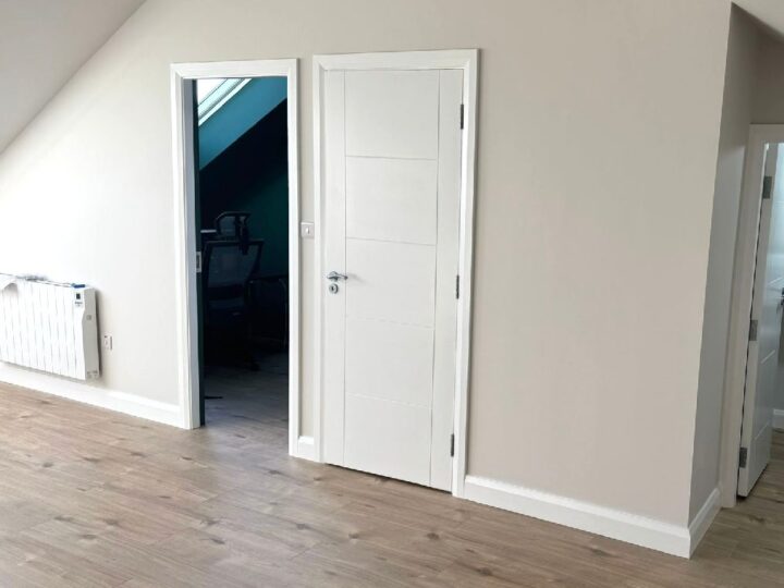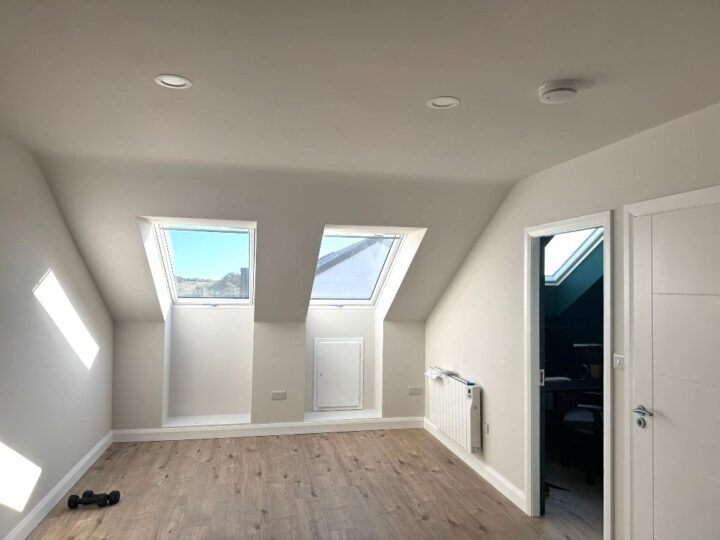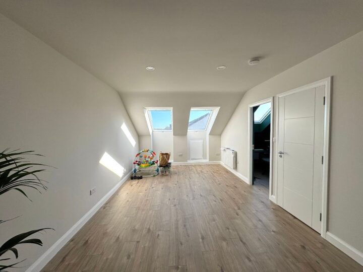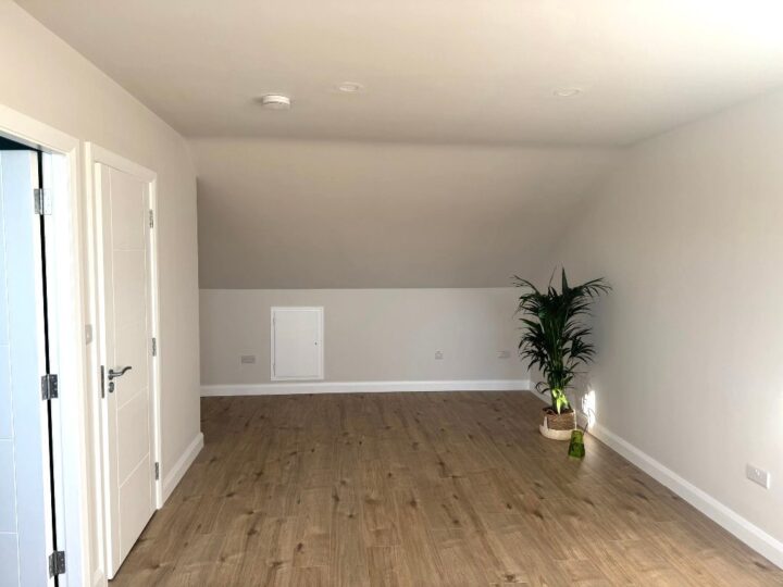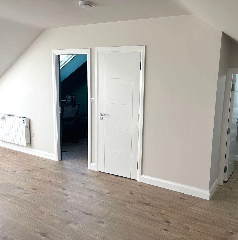 This is a conversion from a new development in Cuirt Bhoirne, Roscam, Galway. This is a large attic with approximately 35 square meters of usable floor area with the added bonus of creating an office area and store room.